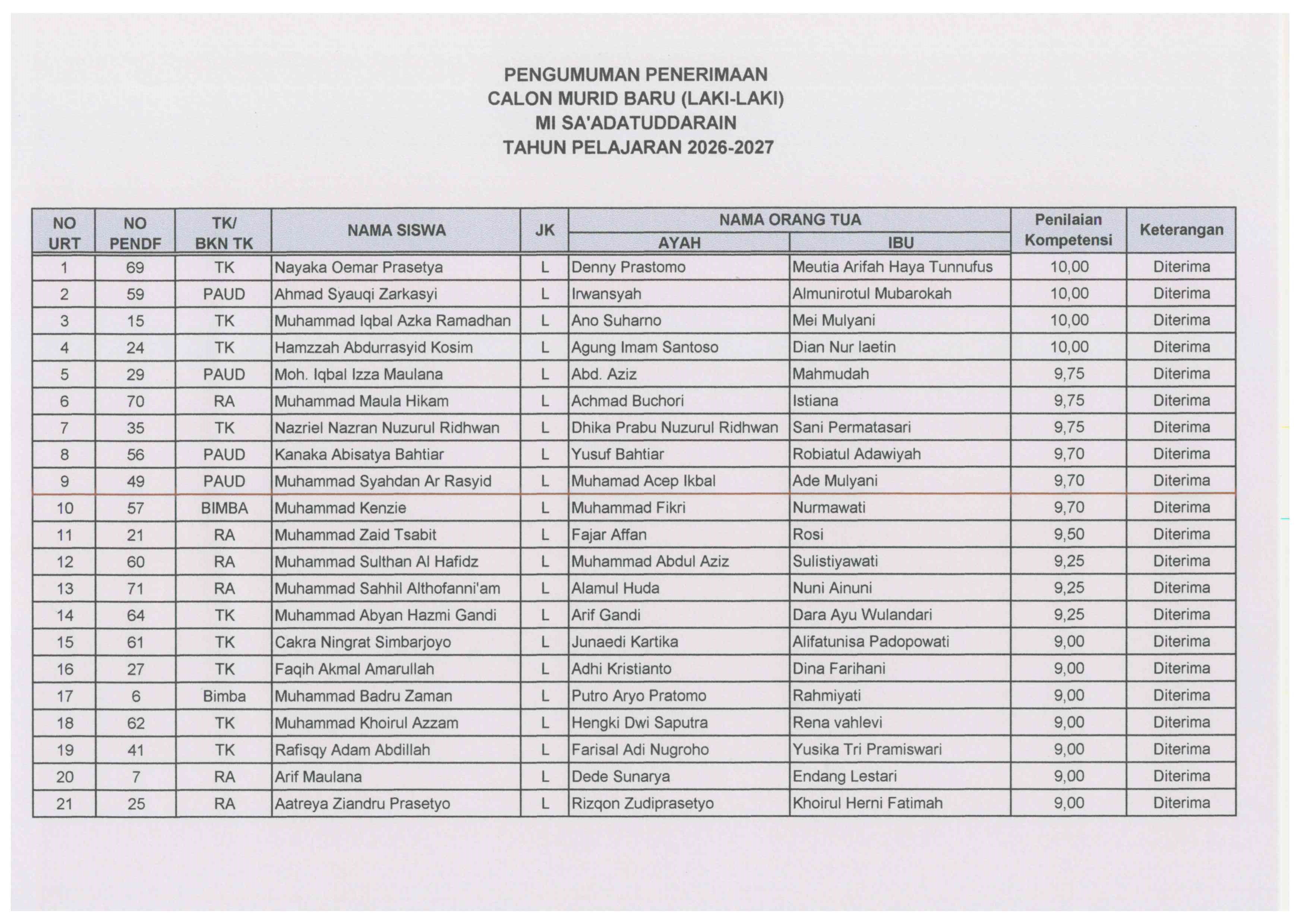 CALON MURID BARU LAKI-LAKI YANG DITERIMA