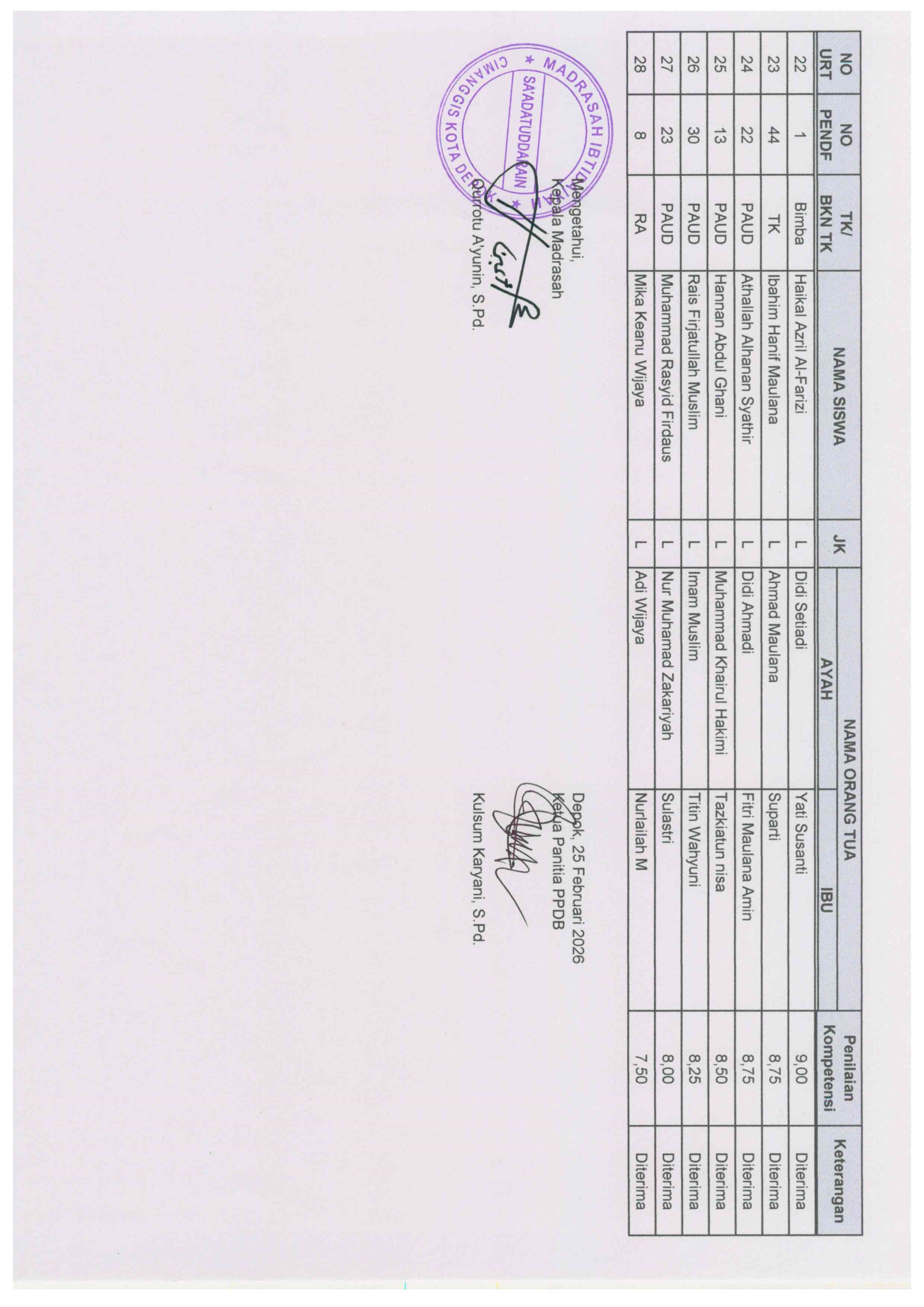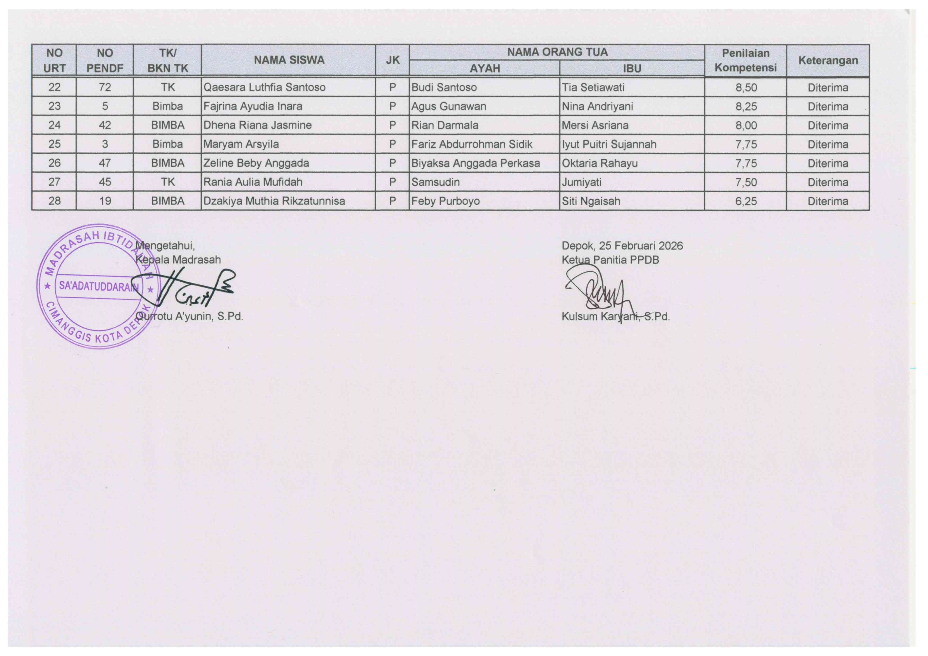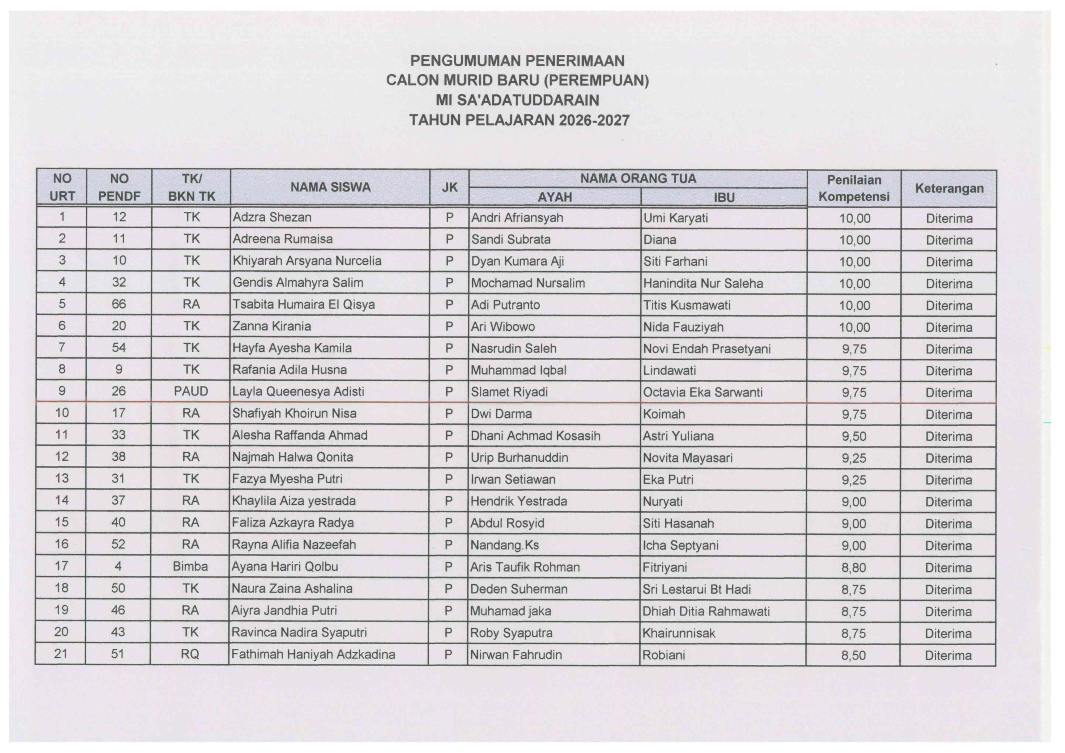 Nama-nama Peserta Yang Terdaftar Di Bawah Ini Merupakan Nama Siswa Yang Dinyatakan Diterima sebagai Calon Murid Baru MIT Sa'adatuddarain Tahun Pelajaran 2026/2027.